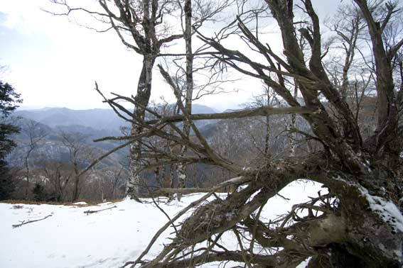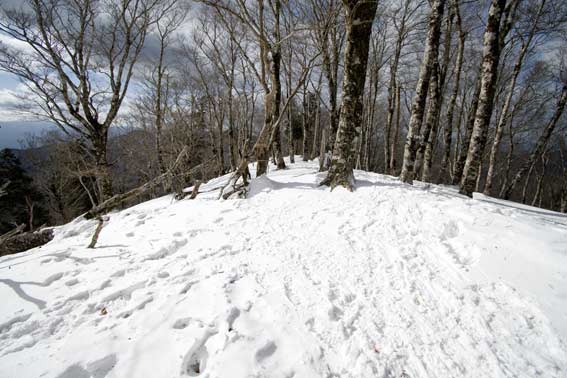 | <川崎記>前日は日本海側大雪で近畿地方山間部も雪予想でしたが登り始めると全然雪なし。それでも千m位からは 雪が出てきます。萬賀さんと画伯は早めにクランポン(アイゼン)、画伯は6爪・萬賀さんはチェーンアイゼン。 私はクランポン着けずもう少し前進し急斜度が始まる少し手前で6爪装着。杉の植林を抜けると雪が増えて 傾斜もきつくなってきますが、画伯はストックを使わないのが流儀なんだと。 それに厚着ですね。 僕は少々寒くても汗かくの嫌いだけど。気温も低いし強風です。歩くの停めたら寒い。 |
