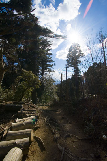 | 小倉神社分岐の手前に手造りのベンチがありそこで一本取った。空は青く天気はものすごくいい。 予報士が3時頃にポンポン山では雪かもとおぬかしである。傘を入れてきたが雪を見たいものだ。 |